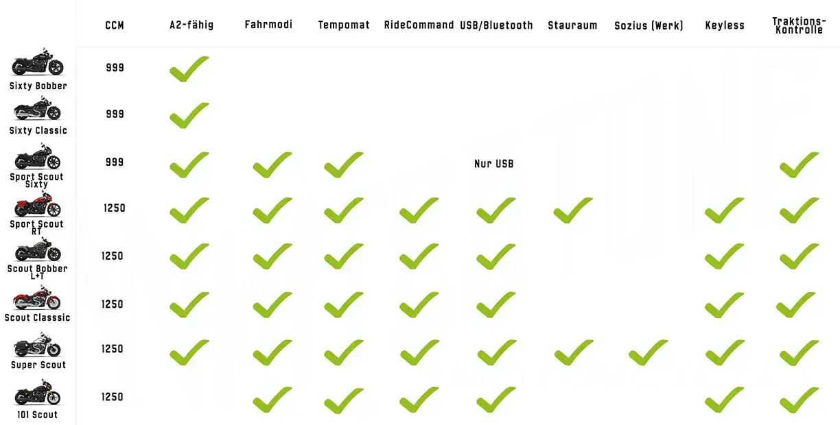Die nachfolgenden Modelle sind alle mit einem flüssigkeitsgekühlten 1250ccm V-Twin Motor ausgestattet. Zudem verfügen sie, ausgenommen der Scout Bobber Standard, alle über die gleichen Komfort- und Sicherheitsfeatures wie RideCommand, Fahrmodi, Traktionskontrolle, Tempomat, schlüssellose Zündung und vieles mehr.